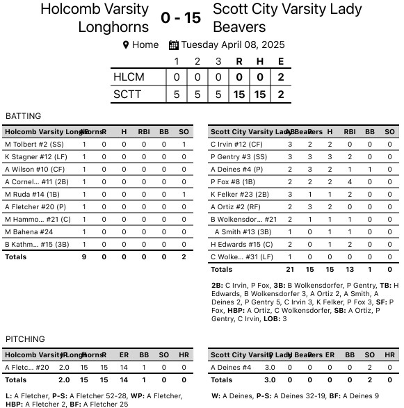 The Lady Beavers would score three in the first, and two in the second inning to lead 5-0. Holcomb would have their first baserunner on a walk in the second inning. They would collect their first hit of the game in the top of the third. Scott City would force Holcomb to strand three baserunners in three innings. The Lady Beavers would put the game away for good in the bottom of the third with 10 runs, to end the game 15-0 with one out in the bottom of the inning.