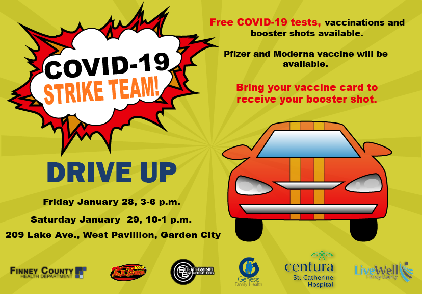 GARDEN CITY, Kan (WesternKansasNews.Com) – Genesis Family Health, together with LiveWell Finney County, Centura Health, the Finney County Health Department, Southwind Broadcasting, and LaKeBuena Radio will host a drive-thru testing and vaccination event this Friday and Saturday, January 28th and 29th at the Finney County Fairgrounds.