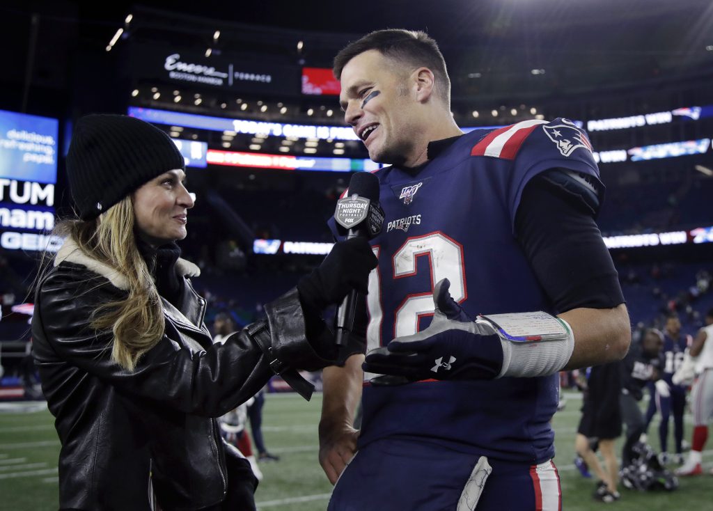 FILE - Fox Sports television sideline broadcast reporter Erin Andrews, left, interviews then-New England Patriots quarterback Tom Brady at midfield after an NFL football game between the Patriots and the New York Giants, Thursday, Oct. 10, 2019, in Foxborough, Mass. Seven-time Super Bowl champion Tom Brady will join Fox sports as its lead football analyst once his playing career ends, the network said on Tuesday, May 10, 2022. When that actually happens is unclear, since Brady recently renounced his announced retirement and said he plans to continue playing for the Tampa Bay Bucs. (AP Photo/Elise Amendola, File)