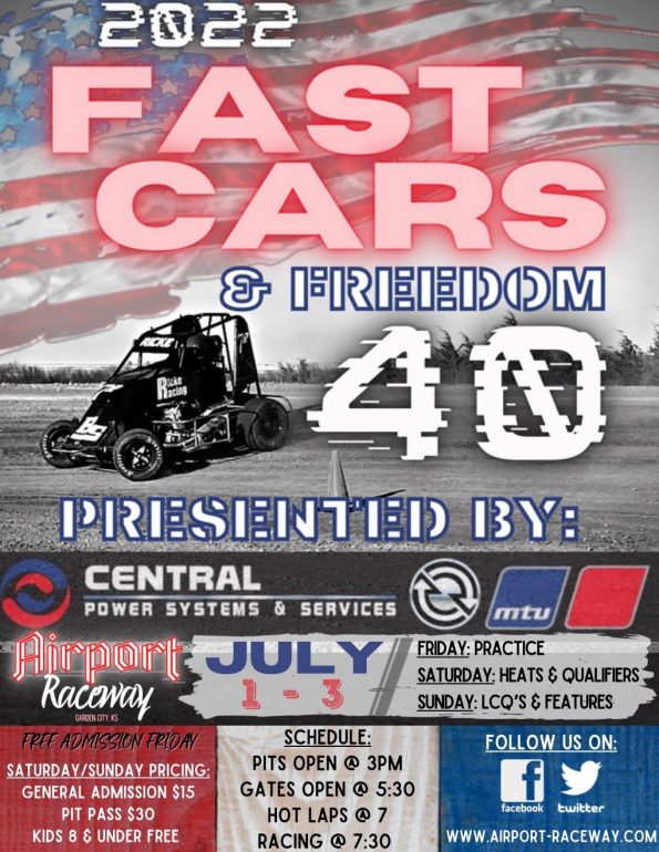 Garden City, Kan (WesternKansasNews.Com) – Airport Raceway in Garden City is back again on the fourth of July weekend for its inaugural Fast Cars and Freedom 40. The 3-day event showcases the NOW600 Winged, Restricted, and Wingless Micro Sprints in a dash for over 20,000 in purse money.