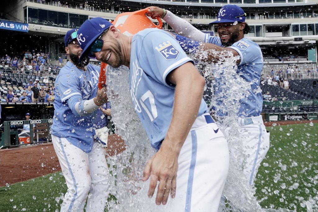 Kansas City Royals' Hunter Dozier (17) is doused with water by Emmanuel Rivera, left, and MJ Melendez as they celebrate a win over the Tampa Bay Rays during a baseball game Sunday, July 24, 2022, in Kansas City, Mo. (AP Photo/Ed Zurga)