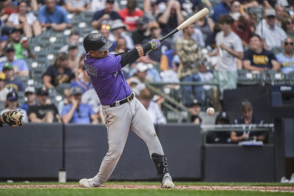 Colorado Rockies' Jose Iglesias hits a single during the fifth inning of a baseball game against the Milwaukee Brewers, Sunday, July 24, 2022, in Milwaukee. (AP Photo/Kenny Yoo)