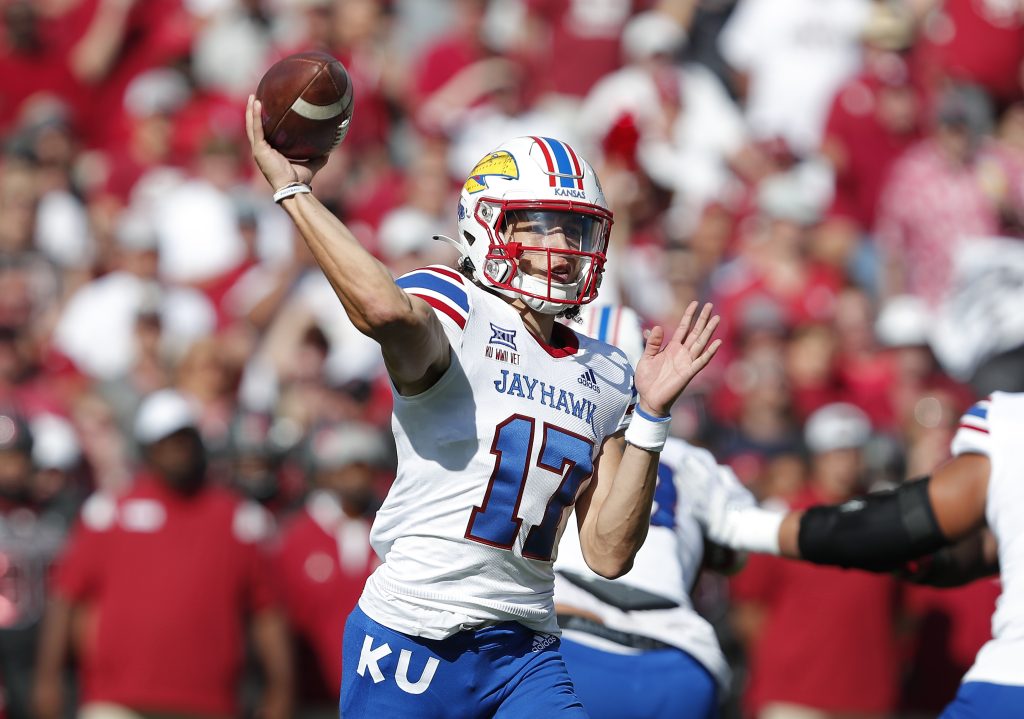 Kansas quarterback Jason Bean (17) throws a pass against Oklahoma during the first half of an NCAA college football game Saturday, Oct. 15, 2022, in Norman, Okla. (AP Photo/Alonzo Adams)