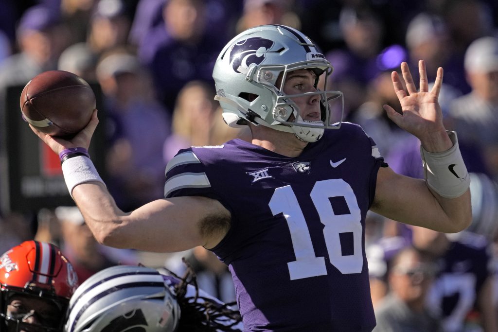 Kansas State quarterback Will Howard throws during the first half of an NCAA college football game against Oklahoma State Saturday, Oct. 29, 2022, in Manhattan, Kan. (AP Photo/Charlie Riedel)