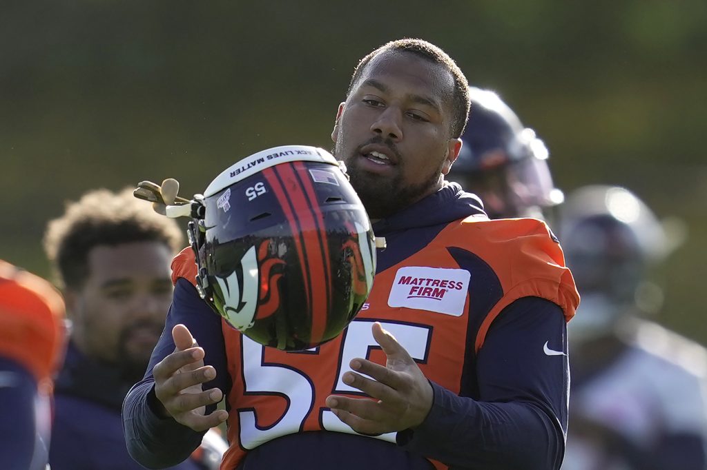 Denver Broncos Bradley Chubb attends a practice session in Harrow, England, Wednesday, Oct. 26, 2022 ahead the NFL game against Jacksonville Jaguars at the Wembley stadium on Sunday. (AP Photo/Kin Cheung)