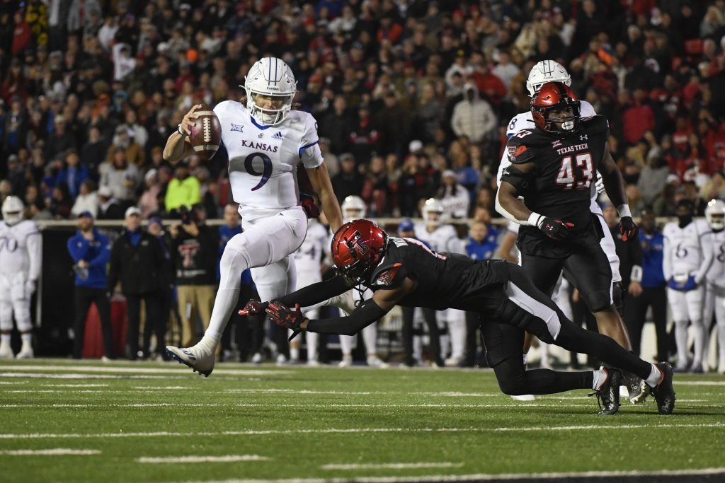 Kansas quarterback Jason Bean (9) runs the ball against Texas Tech defensive back Rayshad Williams (0) during the first half of an NCAA college football game, Saturday, Nov. 12, 2022, in Lubbock, Texas. (AP Photo/Justin Rex)