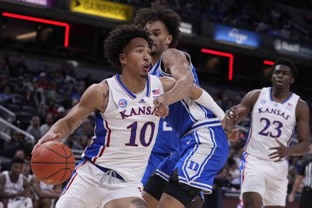 Kansas forward Jalen Wilson (10) drives around Duke guard Tyrese Proctor, center, during the second half of an NCAA college basketball game, Tuesday, Nov. 15, 2022, in Indianapolis. (AP Photo/Darron Cummings)