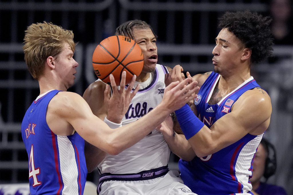 Kansas guard Gradey Dick (4) and forward Jalen Wilson, right, try to steal the ball from Kansas State forward Keyontae Johnson (11) during the first half of an NCAA college basketball game Tuesday, Jan. 17, 2023, in Manhattan, Kan. (AP Photo/Charlie Riedel)