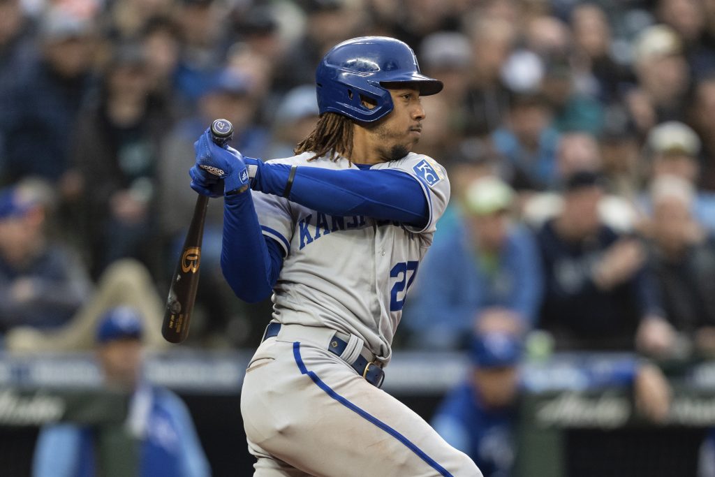 FILE - Kansas City Royals' Adalberto Mondesi bats against the Seattle Mariners on Saturday, April 23, 2022, in Seattle. The Royals acquired left-hander Josh Taylor from the Boston Red Sox for injury-prone shortstop Adalberto Mondesi and an additional player on Tuesday, Jan. 24, 2023, the second straight day that Kansas City dealt one of its surplus position players in a bid to upgraded its lackluster bullpen.(AP Photo/Stephen Brashear, File)