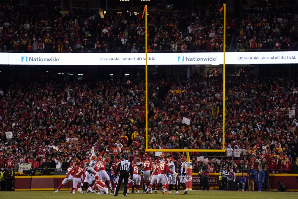 Kansas City Chiefs place kicker Harrison Butker (7) kicks a field goal against the Cincinnati Bengals during the first half of the NFL AFC Championship playoff football game, Sunday, Jan. 29, 2023, in Kansas City, Mo. (AP Photo/Jeff Roberson)