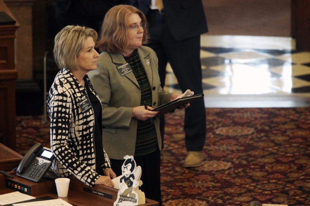 Kansas state Reps. Barb Wasinger, R-Hays, left, and Cindi Howerton, right, R-Wichita, follow a debate in the House over a proposal they favor for banning TikTok from state government devices, Thursday, Feb. 16, 2023, at the Statehouse in Topeka, Kansas. Wasinger is chair of the committee that sponsored the measure, and Howerton led the supporters in the debate. (AP Photo/John Hanna)