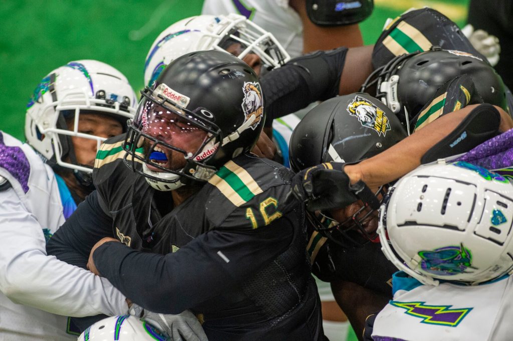 DODGE CITY–Karonce Higgins hauled in four touchdown catches for Gillette, and the Mustangs took down the Storm 30-12 in the Storm’s season-opener Saturday at United Wireless Arena.