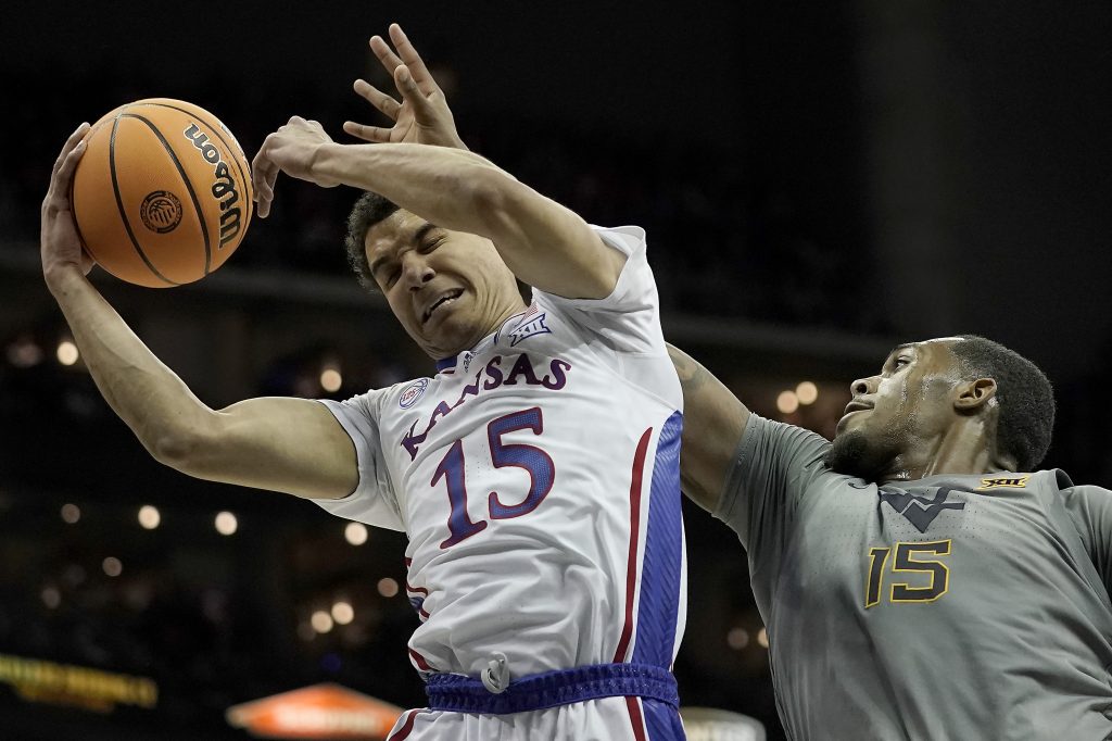Kansas guard Kevin McCullar Jr., left, beats West Virginia forward Jimmy Bell Jr. (15) to a rebound during the first half of an NCAA college basketball game in the second round of the Big 12 Conference tournament Thursday, March 9, 2023, in Kansas City, Mo. (AP Photo/Charlie Riedel)