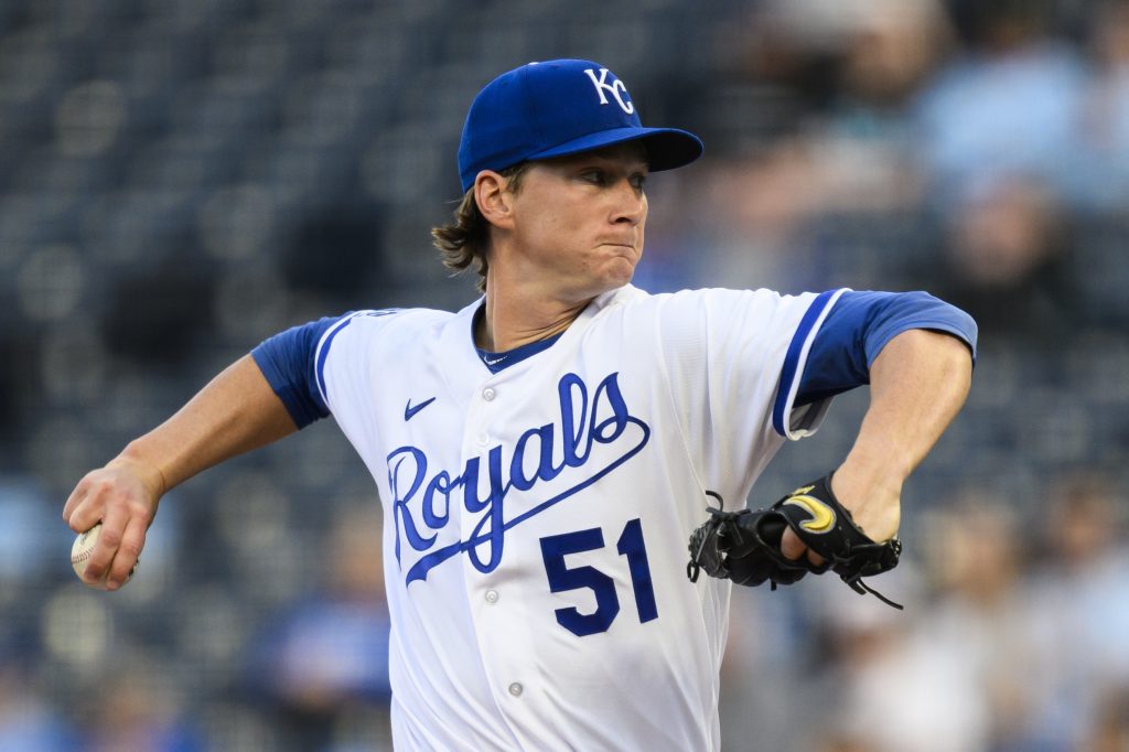 Kansas City Royals starting pitcher Brady Singer throws during the first inning of a baseball game against the Toronto Blue Jays, Monday, April 3, 2023, in Kansas City, Mo. (AP Photo/Reed Hoffmann)