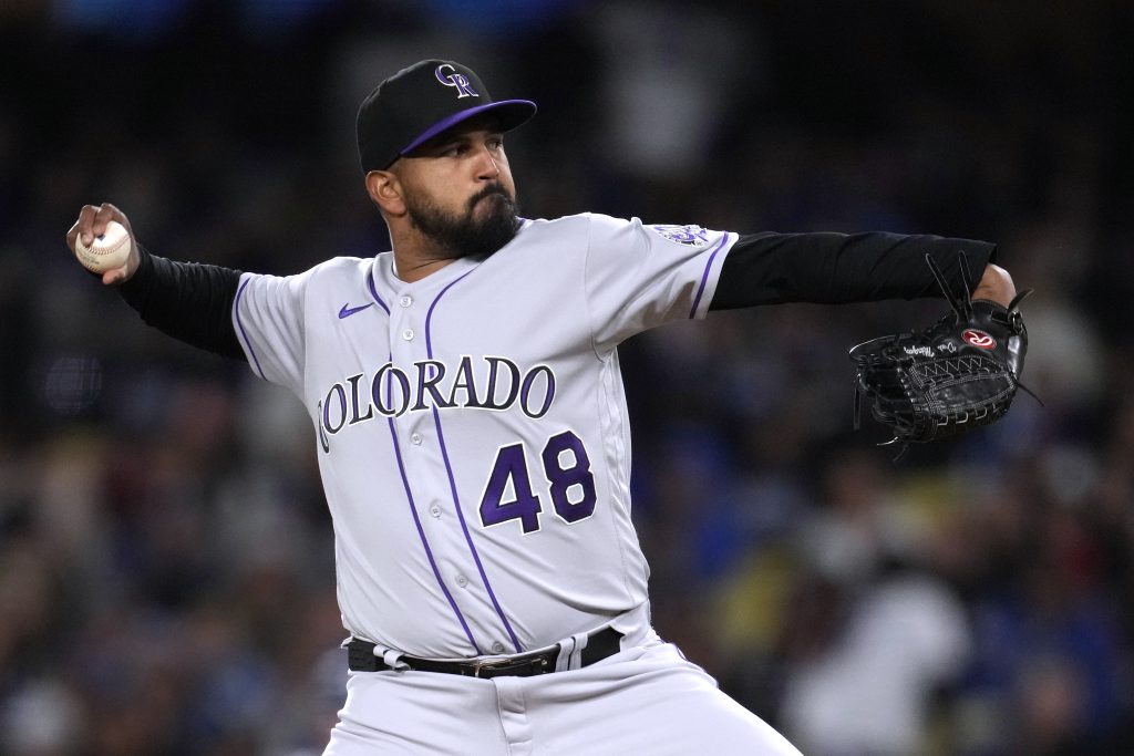 Colorado Rockies starting pitcher German Marquez throws to a Los Angeles Dodgers batter during the fourth inning of a baseball game Tuesday, April 4, 2023, in Los Angeles. (AP Photo/Marcio Jose Sanchez)