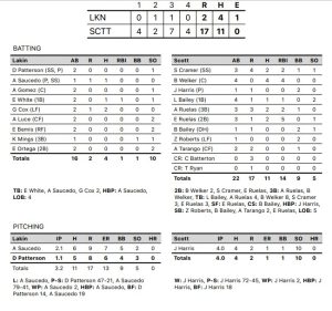 Eloy Ruelas drove in five runs, while Brady Welker had a four-hit game and had four RBI, as Scott City collected 11 hits in the game. JP Harris struck out 10 batters in four innings, and gave up two runs, one earned, on four hits. Lakin saw Gabe Cox record two hits in the game. Armando Saucedo took the loss, giving up nine runs, seven earned, on six hits in 2 1/3 innings of work.