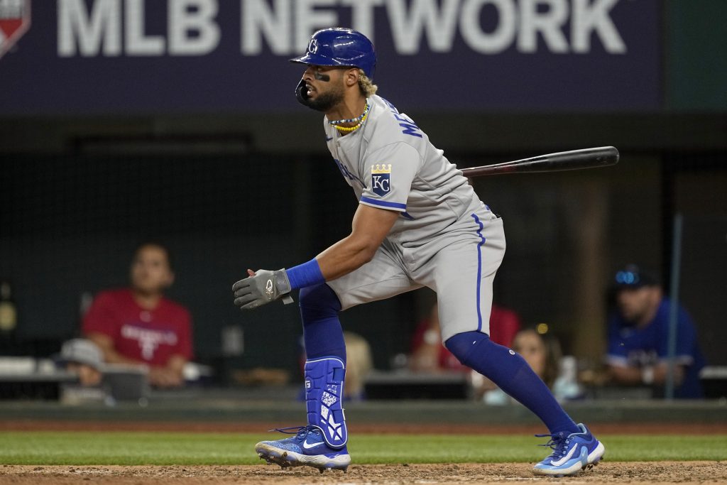 Kansas City Royals' MJ Melendez follows through on an RBI single during the ninth inning of the team's baseball game against the Texas Rangers, Tuesday, April 11, 2023, in Arlington, Texas. (AP Photo/Tony Gutierrez)
