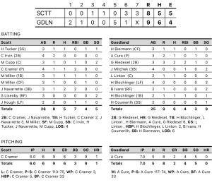 Despite not having a hit in the first inning, Goodland would plate two runs, taking advantage of two walks. They extended their lead in the second inning to 3-0, taking advantage of a pair of errors, as Haley Biermann scored on a pair of errors. Scott City got on the board in the third inning on an RBI by Jordynn Kough that scored Jeserella Navarrette. The Lady Beavers tacked on another run in the fourth on a passed ball to pull to within 3-2.