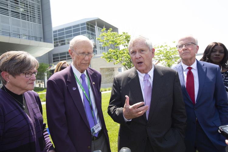 Tom Vilsack, U.S. Secretary of Agriculture, middle, answers questions from the press alongside, from left, Gov. Laura Kelly, former Kansas Senator Pat Roberts, Kansas Senator Jerry Moran and Chavonda Jacobs-Young, USDA chief scientist, following the ribbon cutting and dedication ceremony for the National Bio and Agro-Defense Facility (NBAF) facility in Manhattan, Kan. (Evert Nelson/The Topeka Capital-Journal via AP)