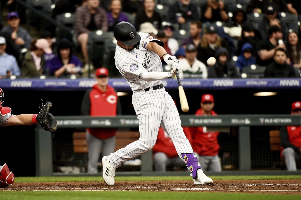Colorado Rockies' Ezequiel Tovar hits a home run in the sixth inning of a baseball game against the Cincinnati Reds Tuesday, May 16, 2023, in Denver. (AP Photo/Geneva Heffernan)