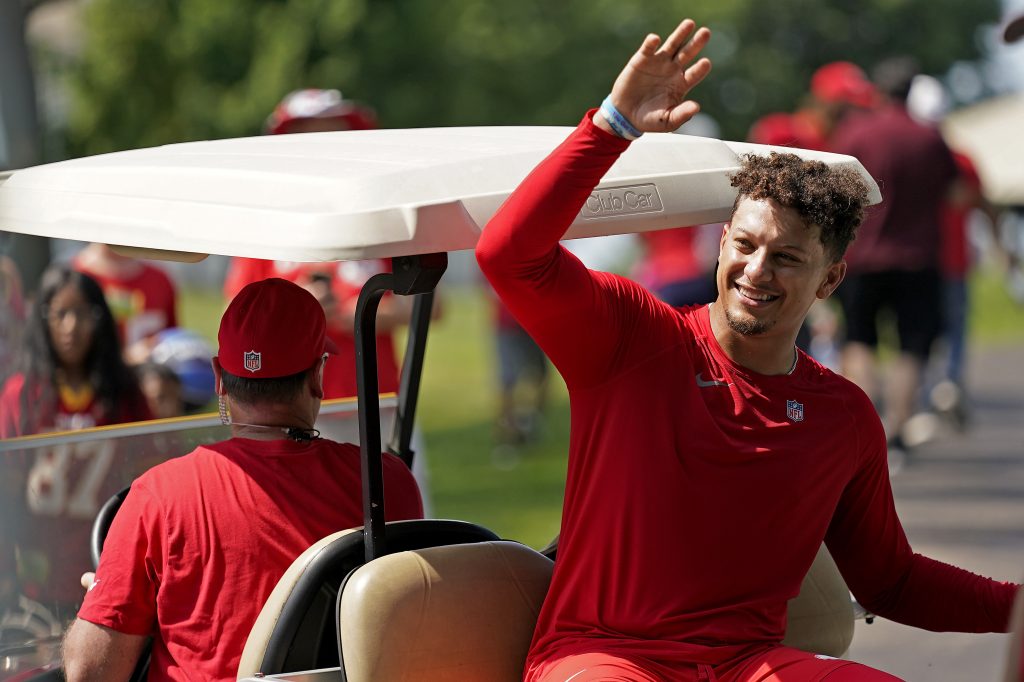 Kansas City Chiefs quarterback Patrick Mahomes waves to fans after NFL football training camp Sunday, July 23, 2023, in St. Joseph, Mo. (AP Photo/Charlie Riedel)