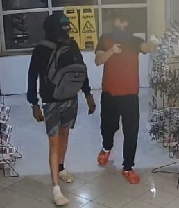 The suspect who stole the vape pens was wearing a black hoodie, white/black/gray striped shorts, white Crocs, and a gray backpack. The suspect appears to be a white or Hispanic male.