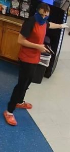 The suspect with the handgun was wearing a red/black t-shirt, black pants, orange Crocs, and a blue balaclava face mask, and appears to be a white male.