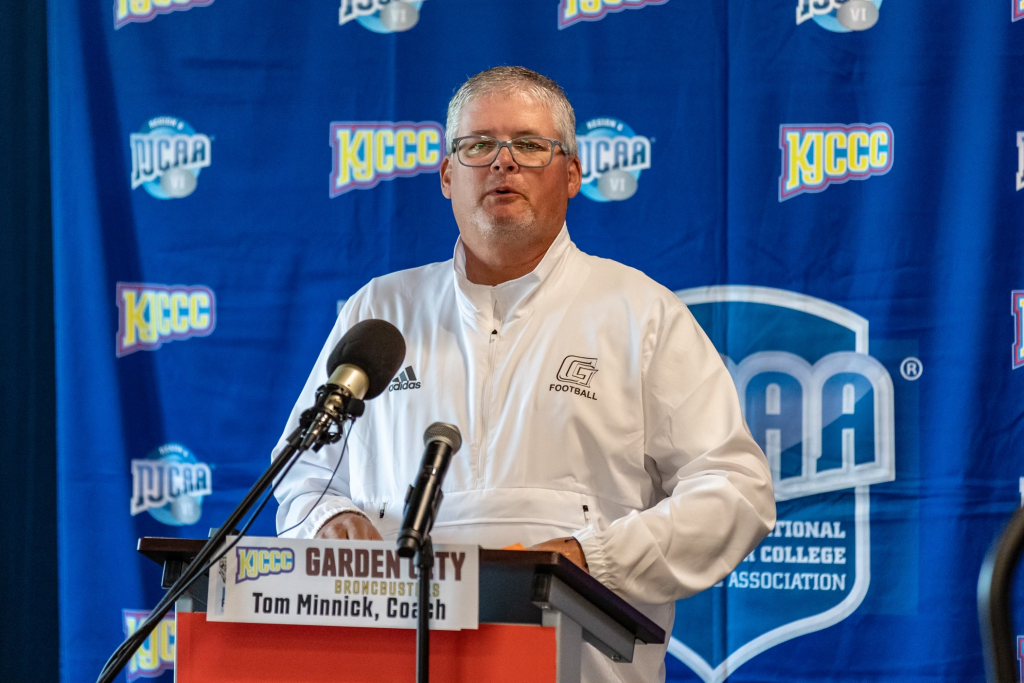 Garden City Community College Football Head Coach Tom Minnick speaks at 2023 Media Day (Credit Adam Shrimplin, Garden City Athletics)