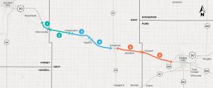 The four segments have been bundled into two groups for design and construction—a western and eastern group. The western group extend from Aerodrome Rd (Garden City Airport) in Finney County east to 7 Rd in Gray County. The eastern group extend from 7 Rd in Gray County east to Cimarron.