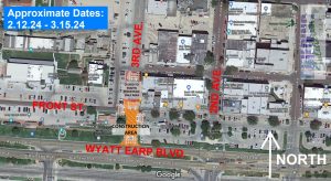 Dodge City, Kan. (westernkansasnews.com)–Starting Monday, February 12, the parking lot located along Front Street, between 3rd Avenue and 2nd Avenue, will be officially open to the public. As a result of this completion, Building Solution will commence phase 3A of their ongoing project on the same day, focusing on the segment of 3rd Avenue that stretches between Gunsmoke Street and Wyatt Earp Boulevard.