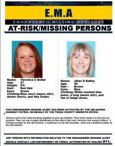 Texas County, Ok. (westernkansasnews.com)–On Saturday, March 30, the Texas County Sheriff’s Department requested the Oklahoma State Bureau of Investigation to investigate the suspicious disappearance of 27-year-old Veronica Butler and 39-year-old Jilian Kelley.