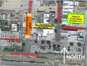 This phase will include a small section of 3rd Avenue ending at the Fidelity State Bank drive-through exit and the intersection of Gunsmoke and 3rd Avenue, as indicated on the map below. Please note that Gunsmoke Street between 3rd Avenue and 2nd Avenue will be closed to general traffic to avoid congestion. The only vehicles that will be permitted to use this one-way section of Gunsmoke Street are customers of Fidelity State Bank.