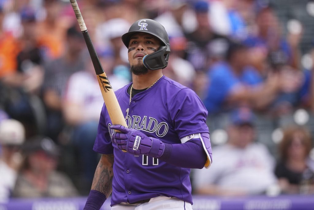 Colorado Rockies' Orlando Arcia reacts after striking out against New York Mets relief pitcher Paul Blackburn in the eighth inning of a baseball game Sunday, June 8, 2025, in Denver. (AP Photo/David Zalubowski)
