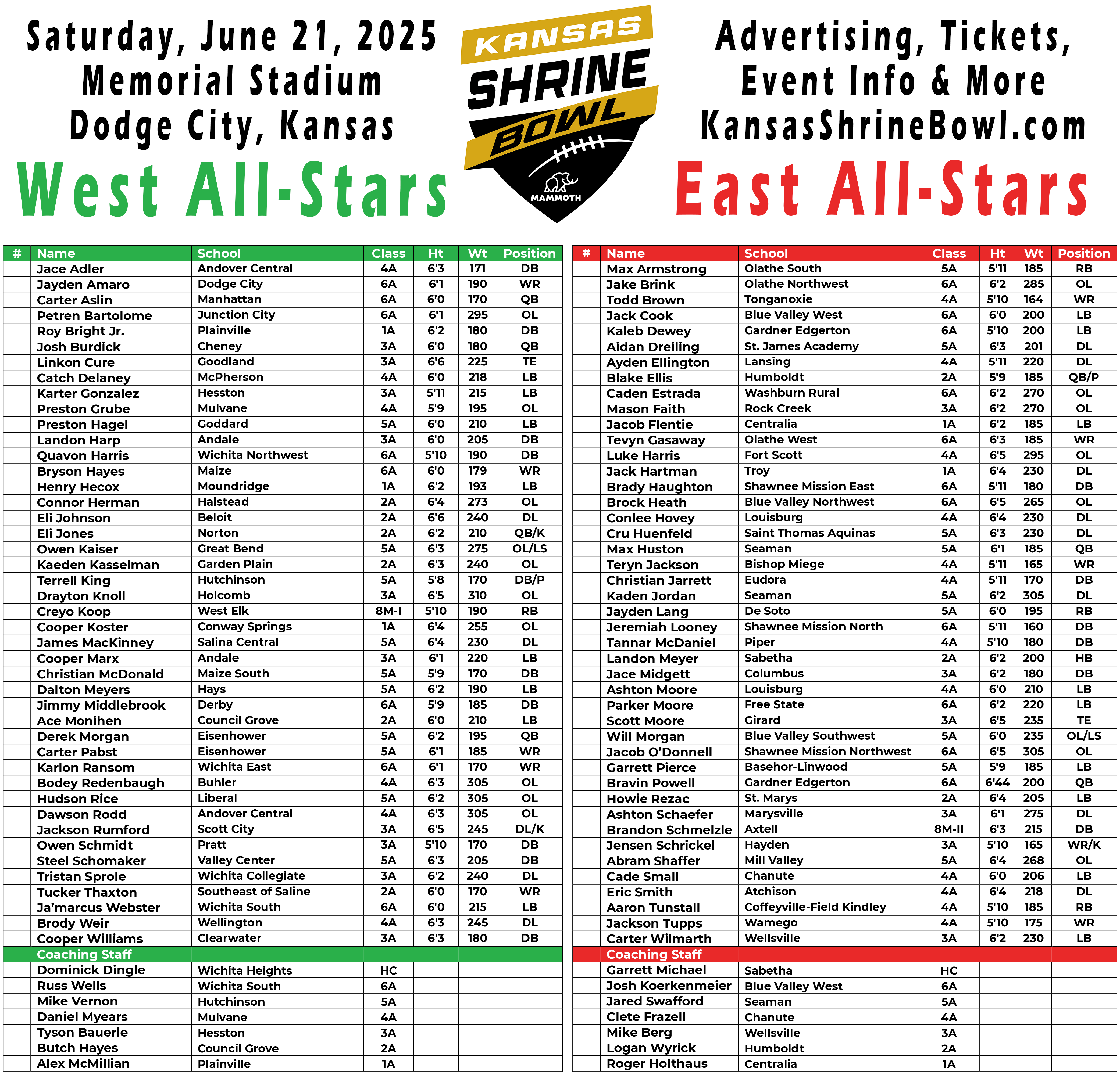 The Kansas Shrine Bowl on Wednesday announced the 88 players across the state of Kansas who were selected to play in the 52nd Annual Kansas Shrine Bowl to be held on Saturday, June 21, at Memorial Stadium in Dodge City. It is the first time since 2019 and the second time that Dodge City will be host to the event.