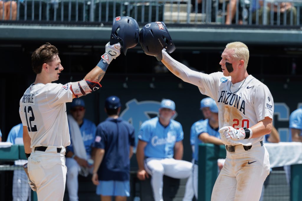 FILE - Arizona's Tommy Splaine (20) celebrates with Easton Breyfogle (12) after scoring a run during an NCAA super regional college baseball game against North Carolina, Saturday, June 7, 2025, in Chapel Hill, N.C. (AP Photo/Ben McKeown)