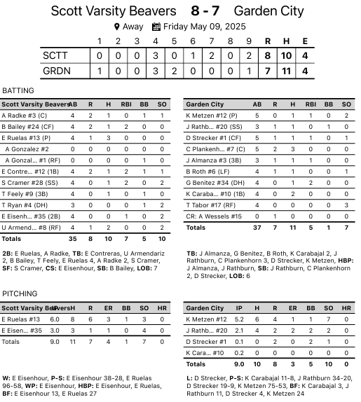 The first game of the day would go back and forth in the mid to late innings. Garden City would lead 1-0 after three innings, thanks to a Drew Strecker RBI single that scored Jakobe Rathburn. In the fourth, Scott City would score three runs to take their first lead, with RBI singles from Emilio Contreras and Spencer Cramer. The Buffaloes would counter with three runs of their own in the bottom of the frame, and extend their lead to 6-3 after five innings. Scott City responded with a run in the sixth and two in the seventh innings to tie the game at six. The Beavers originally thought they had the go-ahead run in the top of the seventh. With a diving catch for the second out by the Buffaloes, Eloy Ruelas tagged up and advanced to third, and would go home on a throwing error to go up 7-6. However, Garden City appealed and they would win the appeal, keeping the game tied at six. It would remain tied in the ninth inning, when Scott City scored two runs to take an 8-6 lead. The Buffaloes would plate a run in the bottom of the frame, but left the tying run at third and the winning run at second, following a fly out to center field to end the game.