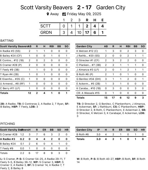Walks and hit by pitches would be the story in the finale of the day. The Buffaloes would take advantage of six hit batters and nine walks. Garden City would plate three runs in the first inning, before Scott City pulled to within 3-1 going into the bottom of the second inning. The Buffaloes batted around in the bottom of the frame and scored four runs, despite having only one hit in the inning. In the third, the Beavers got a sac fly from Brooks Bailey to get to within 7-2. That was the closest they got the rest of the night. Garden City would send 15 to bat in the bottom of the third, and scored 10 runs on only four hits to make the final 17-2.