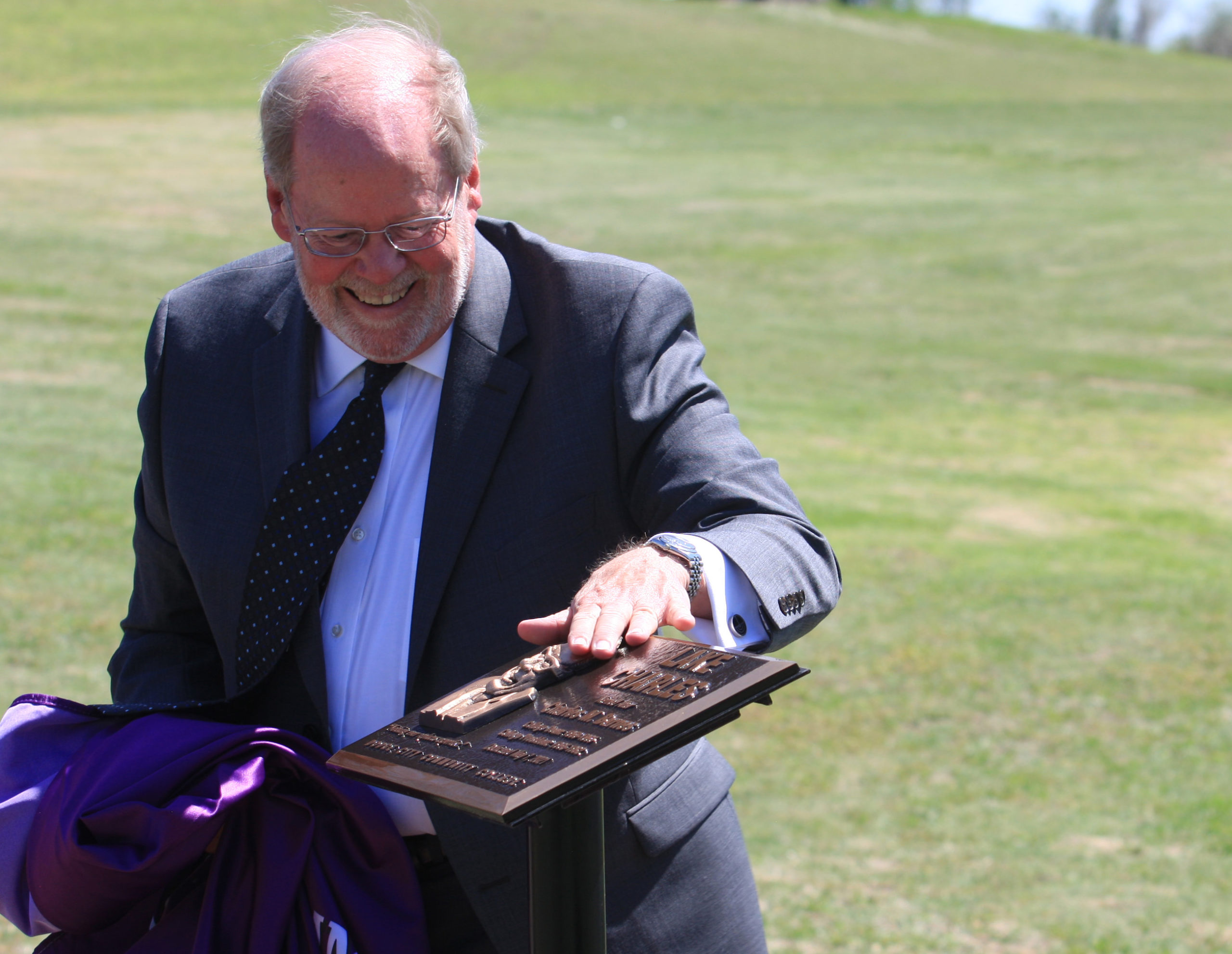 Dr. Roger Barnes unveils the bronze plaque honoring his father, Charles M. Barnes, at the dedication event for DC3’s Lake Charles on May 7. [Photo by Justin Wilson]