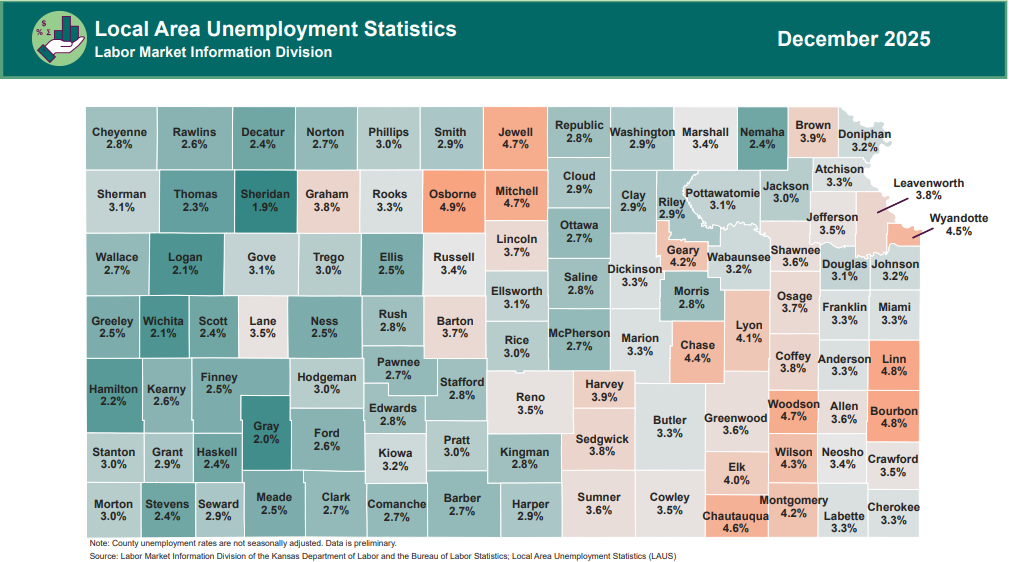 Preliminary estimates reported by the Labor Market Information (LMI) division of the Kansas Department of Labor (KDOL) and the Bureau of Labor Statistics (BLS) show a seasonally adjusted unemployment rate of 3.8% in December. This is unchanged from 3.8% in November and unchanged from 3.8% in December 2024. The labor force participation rate for Kansas increased to 67.5% in December.