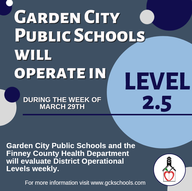 Garden City Public Schools is moving to Level 2.5 Protective Measures starting on Monday, March 29th, from the district operational plan, which was recently updated and approved by the Board of Education. Level 3.5 will be discontinued and masks will be required for all grades and staff at Level 3. Level 2.5 will have the same requirements of level 2, but will also require masks for all grades and staff. The district administration continues to work with the Finney County Health Department on determining the level of protection for students and staff in the district.