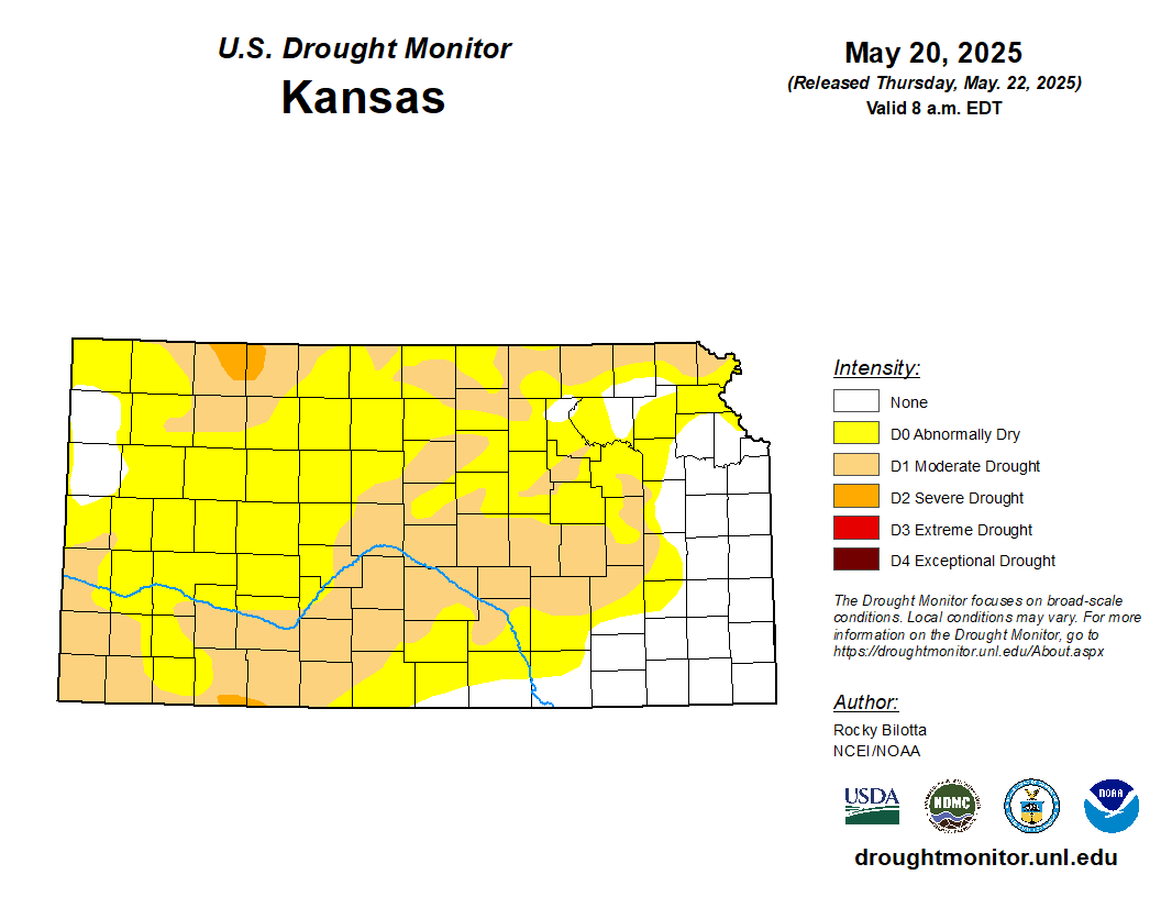 The weekly kansas drought monitor is showing D2 conditions appear in northwest Kansas, which is in the severe drought status. Central Kansas seeing relief from D2 conditions in area last week.