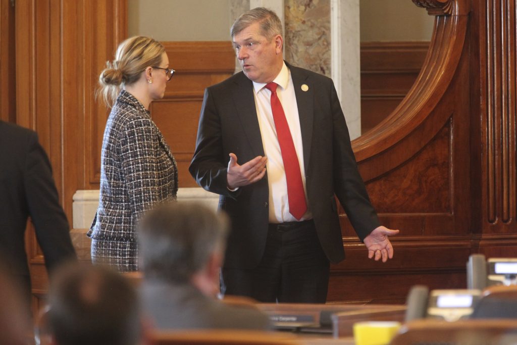 Kansas House Majority Leader Chris Croft, right, R-Overland Park, speaks with Carrie Rahfaldt, left, the House speaker's chief of staff, during a break Friday, April 11, 2025, at the Statehouse in Topeka, Kan. (AP Photo/John Hanna)