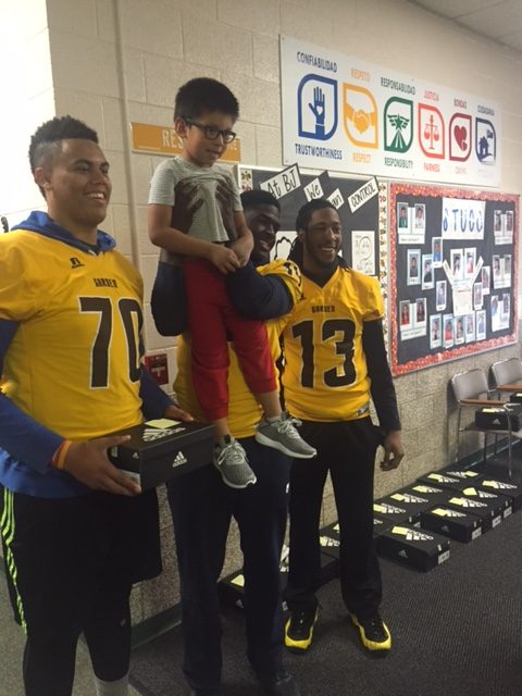 Garden City, KS(westernkansasnews.com) The Garden City Community College football team and Adidas gave back to the community on Thursday morning. Broncbuster head coach Jeff Sims and a few football players gave shoes to students selected by their teachers at Buffalo Jones Elementary School.