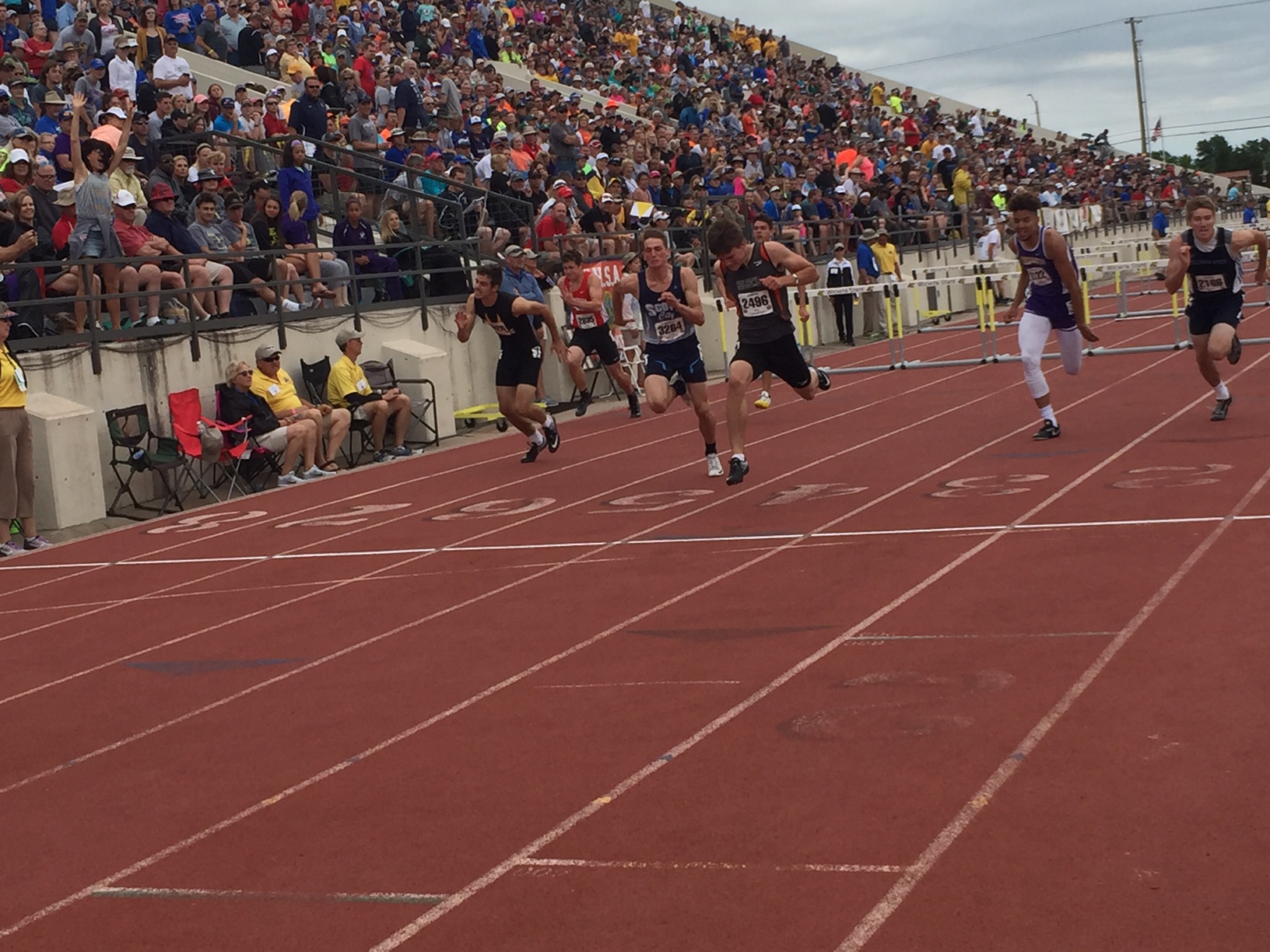 1. Jordan Hawkins, Buhler, 10.67; 2. Jayden Price, Mulvane, 10.72; 3. Zachary Shaffer, Independence, 10.87; 4. Jaden Johnson, Bishop Miege, 10.90; 5. Lamarc’a Tolbert, Atchison, 10.91; 6. Brison Cobbins, Bishop Miege, 10.98; 7. Noah Myers, Pratt, 11.00; 8. Devon Marshall, KC Piper, 11.12