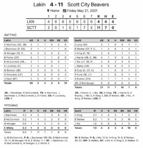 Harrison King gave up four runs, three earned, on three hits in 1/3 of an inning. Brady Welker went 5 2/3, giving up one hit and striking out 10. Jeffery Nix had two hits and drove in four runs, while JP Harris had a three-hit and three RBI performance. Jace Bachman started the game for Lakin, going 4 2/3 innings, giving up four runs, one earned, on four hits, with nine strikeouts. Bode McCormick surrendered four runs, three earned on just one hit, in 2/3 of an inning, and took the loss. Matt Morgan gave up three runs and a hit as well. Lakin ended their season at 10-9.