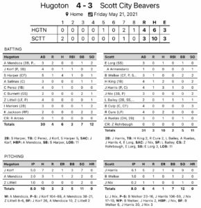 Scott City would take advantage of some early Hugoton errors. In the bottom of the first, the Beavers put up two runs, as JP Harris singled, scoring Brady Welker, and Harrison King scored on a throwing error to third on a pickoff attempt by the Eagles, which gave the Beavers the early 2-0 lead. Hugoton got on the board in the fifth on a one-out single by Sawyer Harper that scored Adam Mendoza. The Eagles next score came on Scott City’s second error of the inning that saw Andres Salinas reach base, and Harper score to tie the game. With two outs, Hugoton took their first lead at 3-2, on an error that scored courtesy runner Ray Arceo.