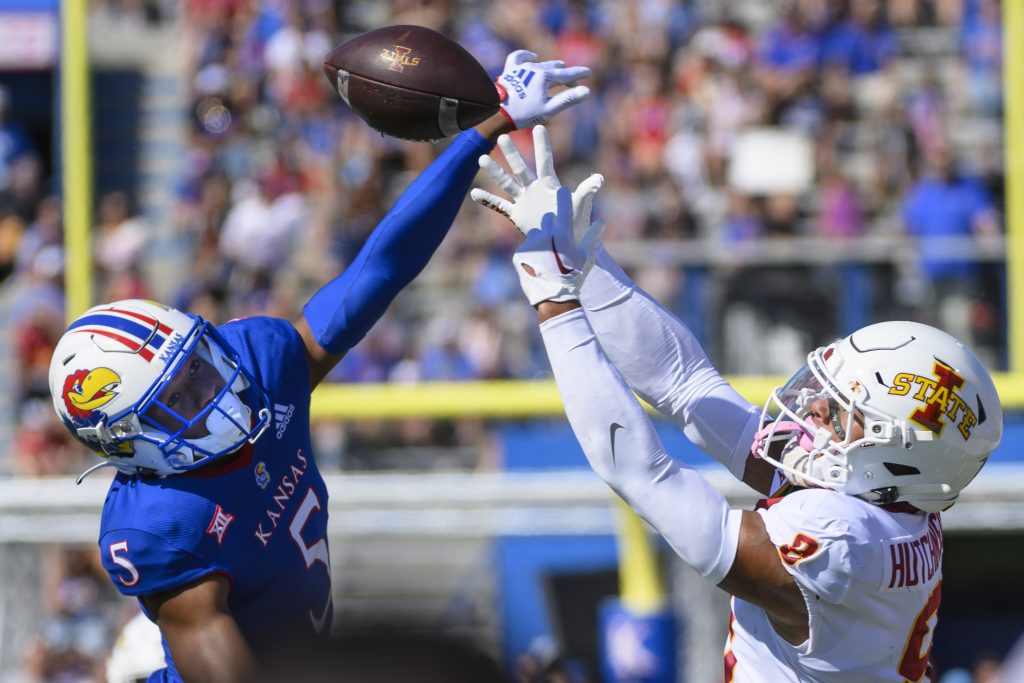 Kansas safety O.J. Burroughs (5) breaks up a pass to Iowa State wide receiver Xavier Hutchinson (8) during the first half of an NCAA college football game, Saturday, Oct. 1, 2022, in Lawrence, Kan. (AP Photo/Reed Hoffmann)