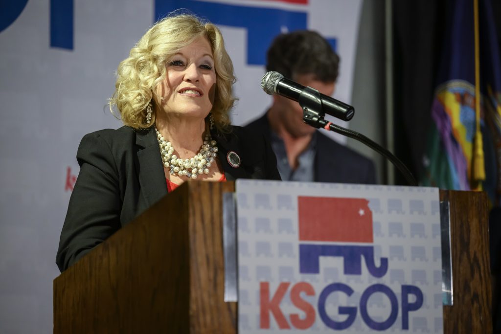 FILE - Vicki Schmidt, Kansas insurance commissioner, gives her victory speech during a Republican watch party in Topeka, Kan., on Nov. 8, 2022. Schmidt disclosed in a statement Wednesday, June 14, 2023, that she had been diagnosed with breast cancer and plans to undergo treatment in the coming weeks. (AP Photo/Reed Hoffmann, File)
