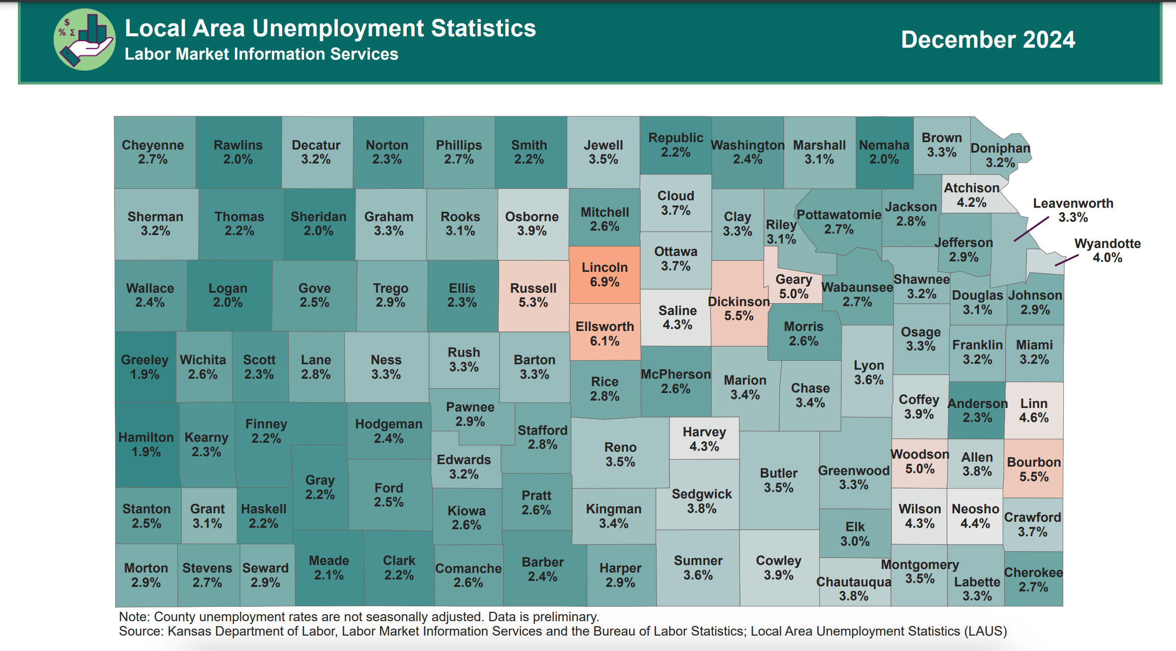 Preliminary estimates reported by the Labor Market Information Services (LMIS) division of the Kansas Department of Labor (KDOL) and the Bureau of Labor Statistics (BLS) show a seasonally adjusted unemployment rate of 3.6% in December. This is an increase from 3.5% in November and an increase from 2.6% in December 2023.