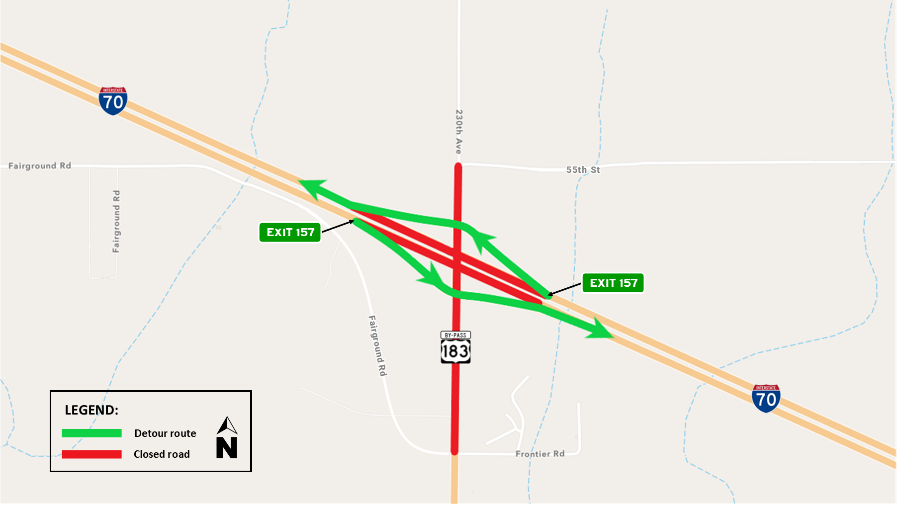 Additional closures will also be in place on the U.S. 183 bypass and 230th Avenue. Northbound lanes on the U.S. 183 bypass will be closed immediately north of the intersection at Fairground and Frontier Roads, and southbound 230th Avenue will be closed immediately south of the 55th Street intersection. Access to I-70 from the U.S. 183 bypass and 230th Avenue will not be available during the closure.